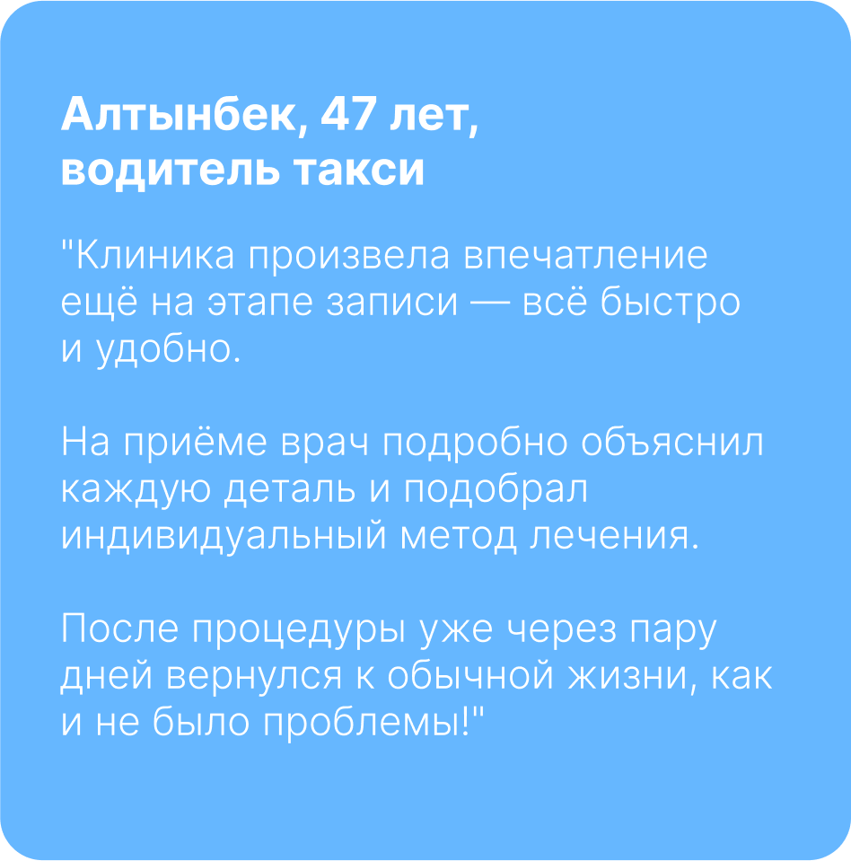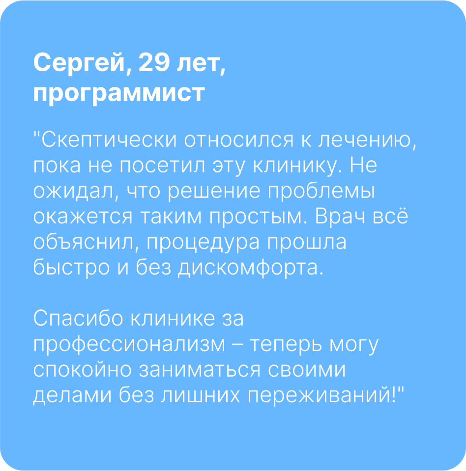 Ответ: Длительность процедуры зависит от выбранного метода лечения, но в среднем занимает не более 30-40 минут. После завершения пациент может сразу вернуться к своим делам.