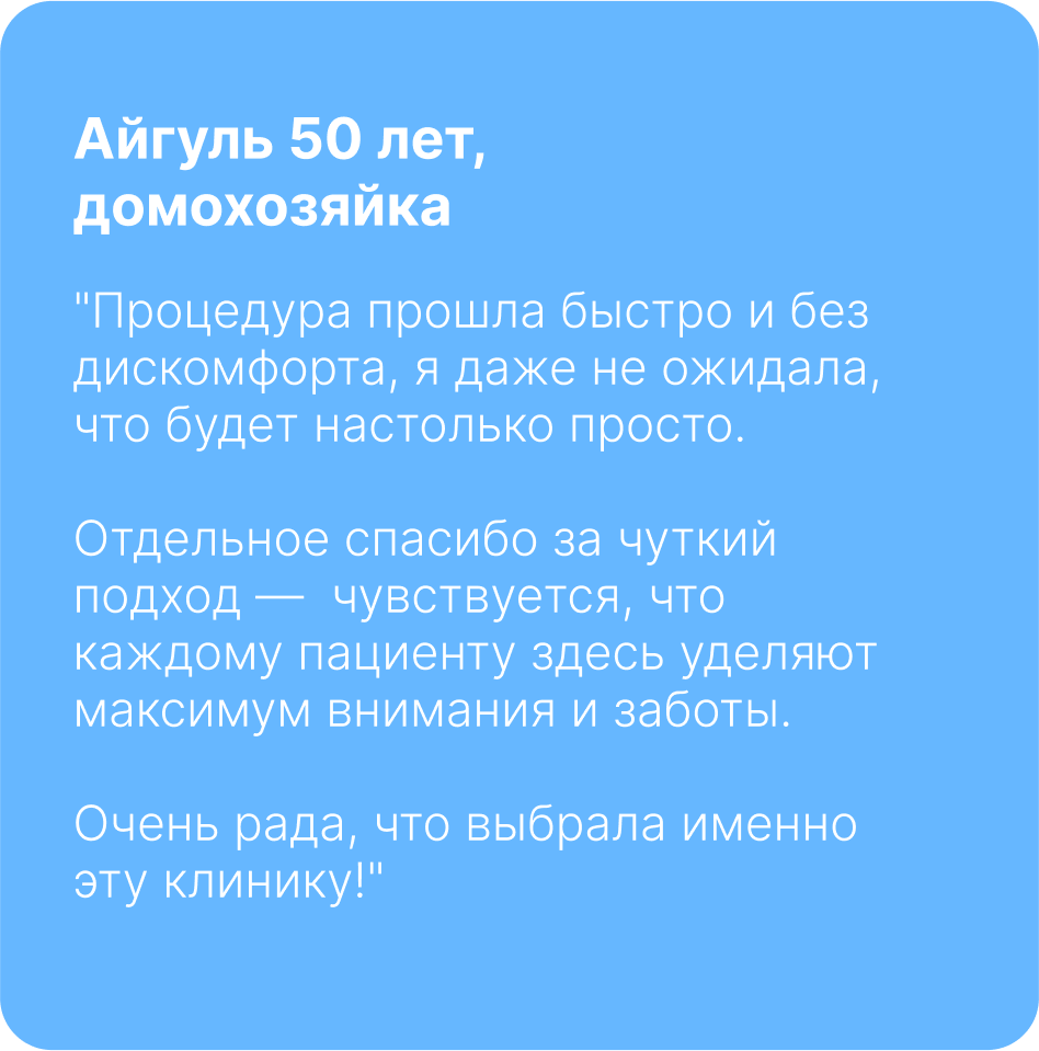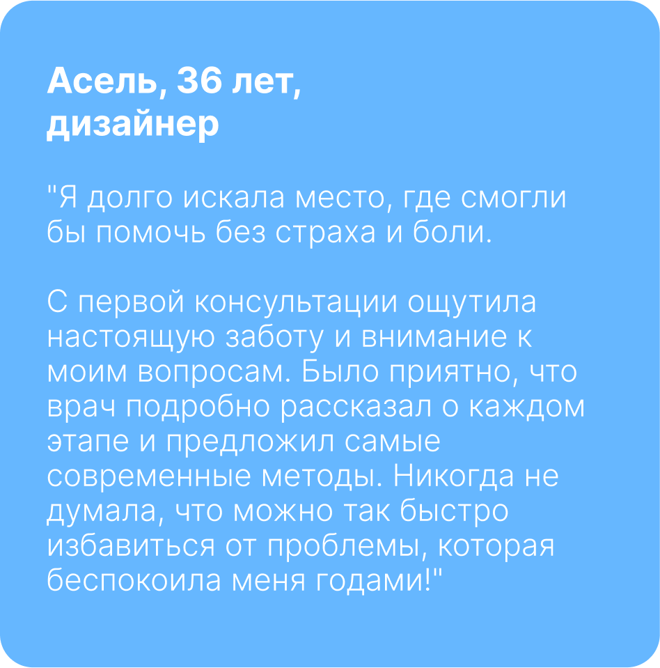 Ответ: В нашей клинике применяются современные малоинвазивные и безболезненные методики лечения. Кроме того, мы используем анестезию при необходимости, чтобы обеспечить максимальный комфорт пациенту.